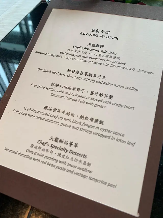 講真如果你要來食呢個餐,我建議你不如慳返啦。呢個餐絕對唔抵食亦都唔好食。我對天龍軒叉燒十分失望,俾人吹捧到天上有地下無,除咗肉質覺得比較林,完全睇唔出亦食唔出係一舊叉燒。可能你要試吓食貴一倍Tasting Menu會比較好但係呢個平價lunch Menu就千祈唔好食,慳得$500得$500。