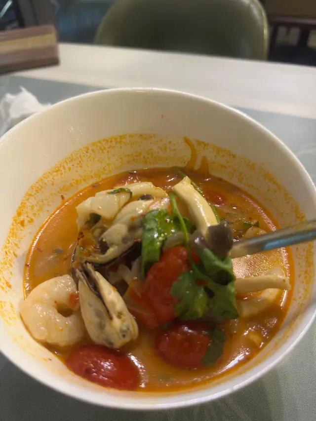 啲料仲要超足料! 大蝦爽口彈牙,青口同魷魚都夠晒鮮味,索盡咗個湯底精華。每啖湯都充滿住海鮮嘅甜味同香料嘅複雜層次,酸酸辣辣,非常開胃,令人一啖接一啖,飲到成個人暖笠笠,好滿足!