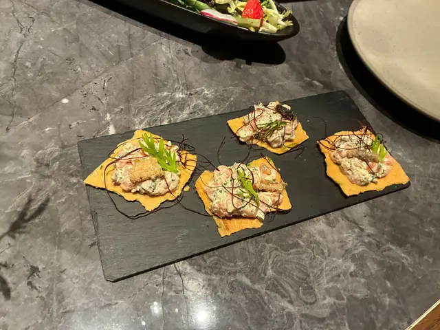 調味方面亦都一絕!廚師好聰明咁加咗少少酸酸地嘅醬汁(我估係檸檬油醋之類?)同埋一啲好細碎嘅洋蔥同酸瓜,完美平衡返三文魚嘅豐腴感。食落味道層次好豐富,鹹香、鮮甜、酸爽同一啲香草氣息,係個口裡面不斷變化,真係好過癮!旁邊仲有幾塊脆卜卜嘅多士,舀一大羹他他放上去,一啖咬落,脆身多士加上冰涼鮮美嘅魚生,個對比真係令人食到唔停口!