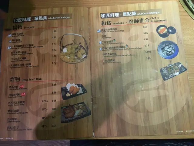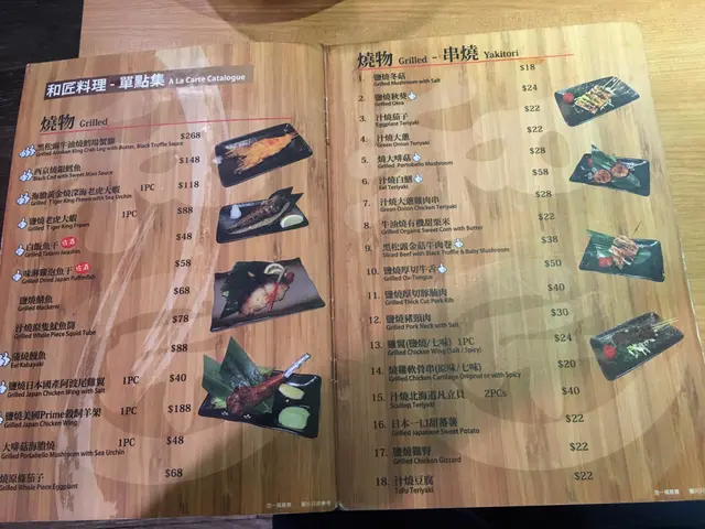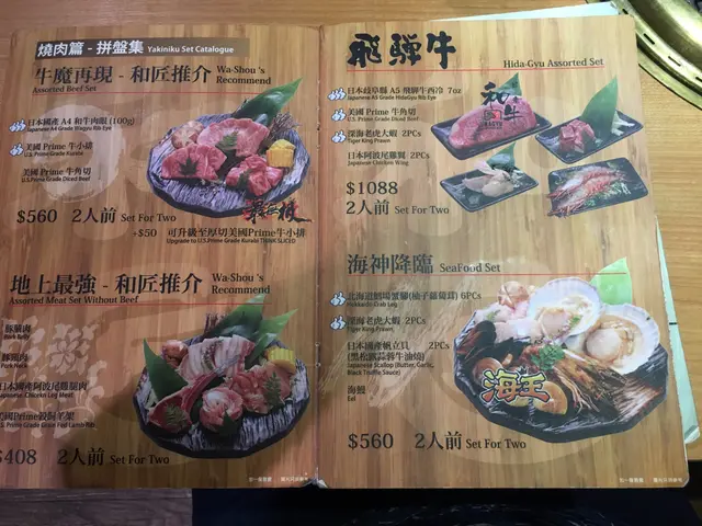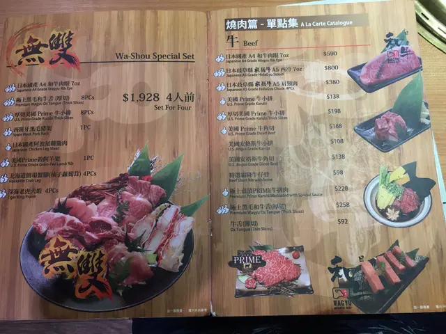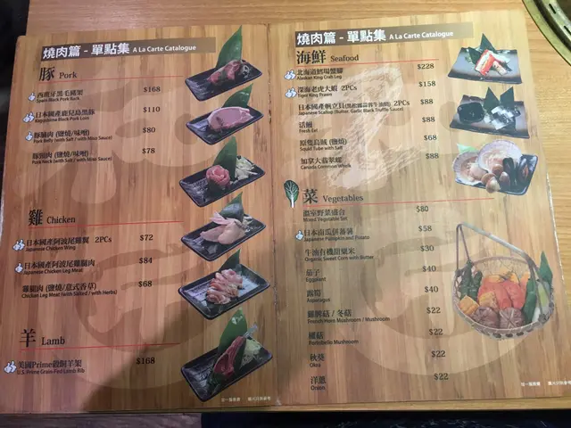 我哋睇咗餐牌先ORDER咗美國PRIME牛小排、美國PRIME牛角切、豚腩肉(鹽燒)和日本產帆立貝, 磯煮鮑魚, 沙律, 雜錦天婦羅和海膽冷稻庭手打烏冬等等, 真係好多選擇, 唔只燒肉咁簡單。