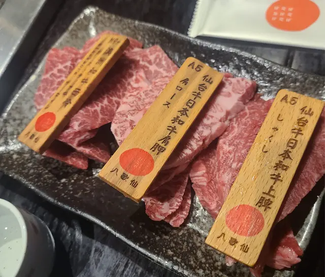 之後到主角喇,佢會每款牛都先上一份,之後就自己再加單,不過我地太肚餓,唔記得左呢個arrangement, 變左一嚟就好多,張枱唔夠位放咁滯,唯有燒快啲,雖然佢每碟都有個牌仔標名係咩部位,但因為太快既關係,結果都唔太知自己食緊邊塊。不過件件都入口即溶,油份剛剛好。