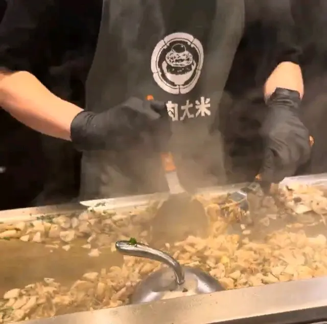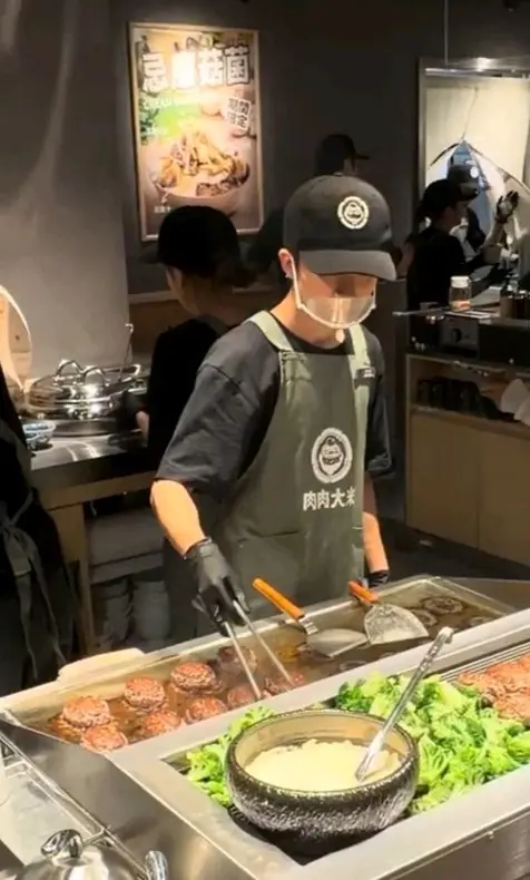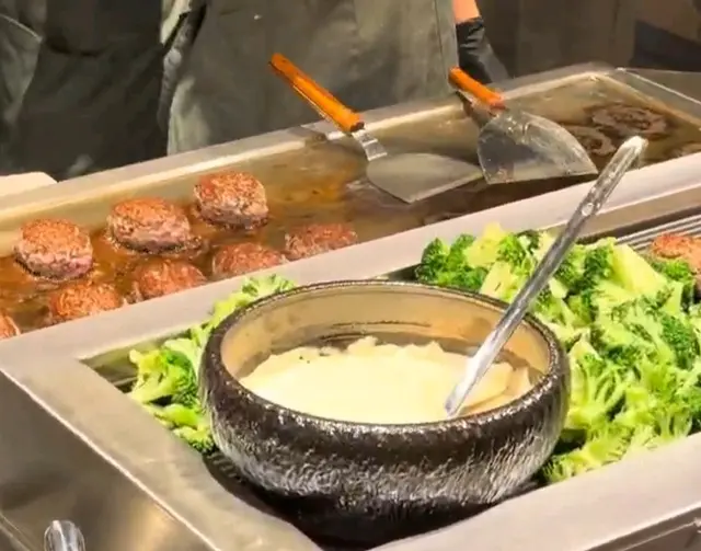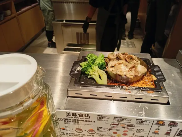 職員係鐵板面前烤漢堡。