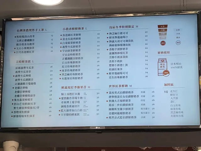 黑糖厚鮮奶/愛情動作草莓牛奶/奇異博士愛草莓/藍天綠草加白白的/抺茶加火龍果珍珠