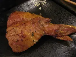 之後進入吃燒海鮮的環節,原隻日本魷魚筒的份量真的幾大,不過又是一款很沒火候的燒物,魷魚筒吃起來還是很濕身,醬料塗得太薄,吃起來沒什味道,幸好配上兩碟磨豉醬,補救了味道不足的問題,兩款磨豉醬之中,本人比較喜歡其中有梅子的那一款,味道更是令魷魚的味道好多了,不過冇火氣的串燒,始終不是本人的心水。