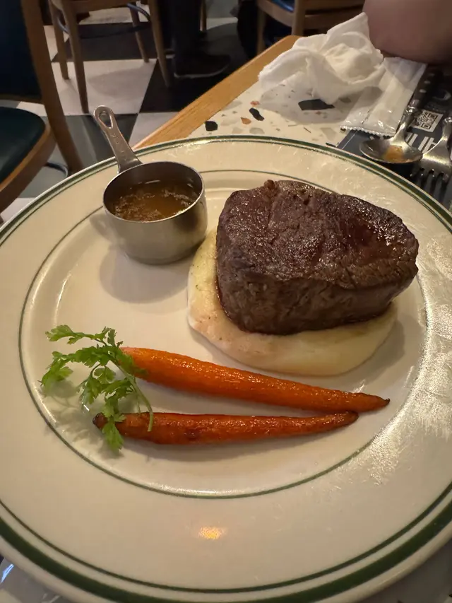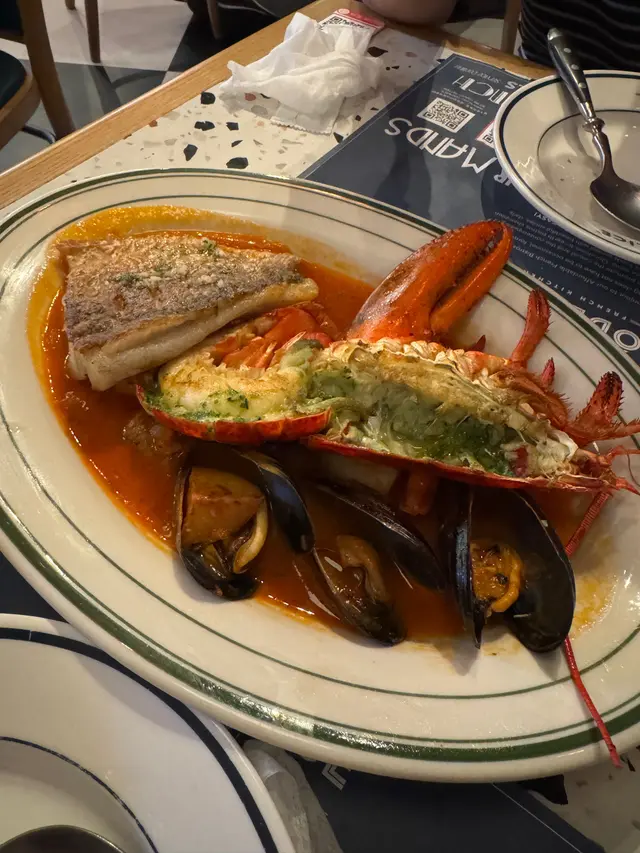 主菜方面,我點咗個龍蝦馬賽魚鍋,朋友食澳洲和牛牛脊。魚鍋個湯底好濃郁,有啲龍蝦鮮味,唔會過鹹,配埋法包一齊點汁都幾正。而牛脊肉煎得啱啱好,唔會太生又唔會太熟,肉質嫩滑,咬落去有肉汁,唔錯。