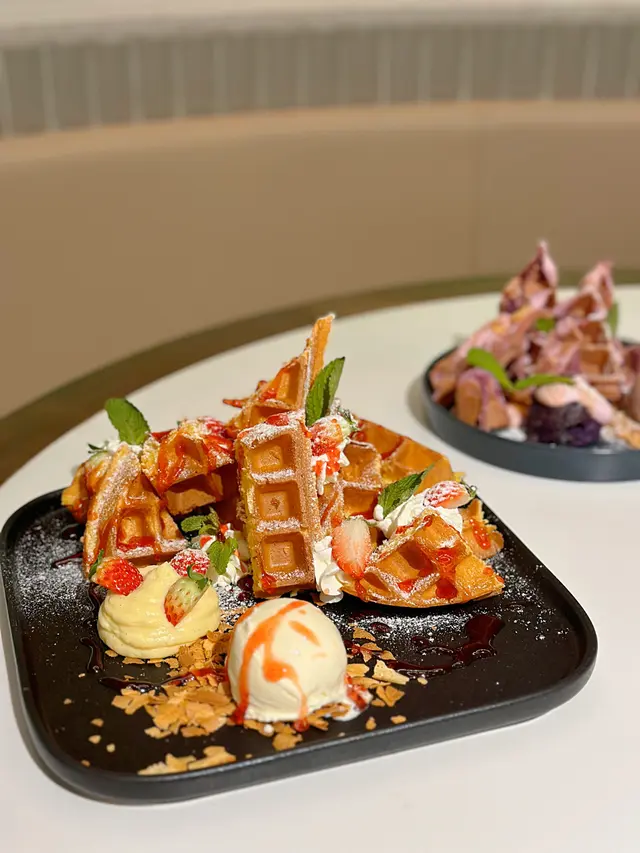 窩夫烤得超脆🧇,真係外脆內軟,質感Real正!好細心幫你切開晒,又砌到成座塔咁好精緻🥰,呢個抵食啦仲大份,一定要Encore!