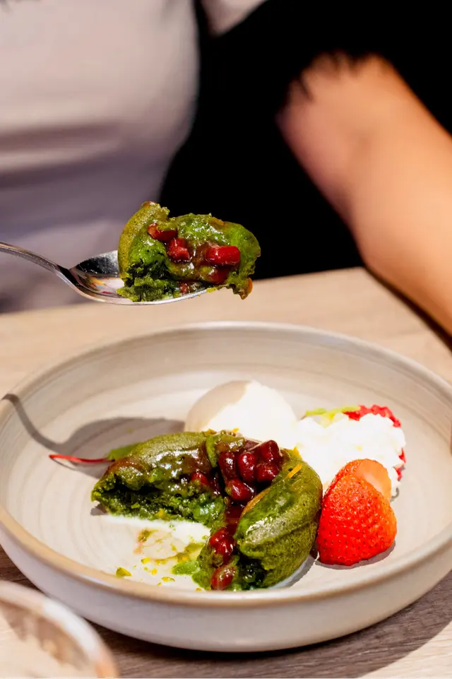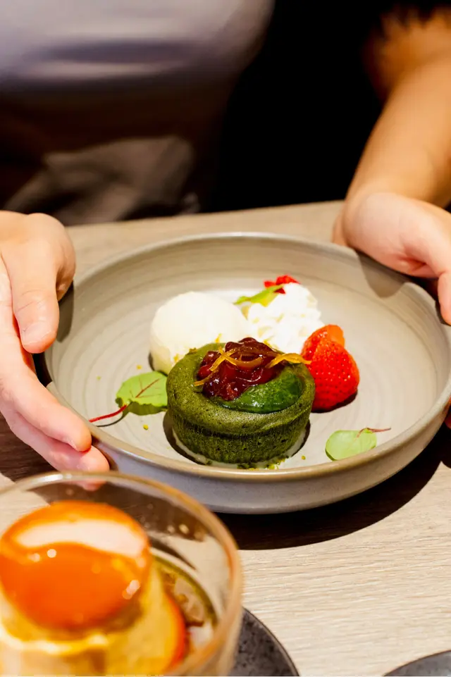 抹茶蛋糕賣相精緻,切開即湧出濃厚的流心抹茶醬,味道在甘醇抹茶與香甜紅豆之間平衡,散發濃厚日式風情。