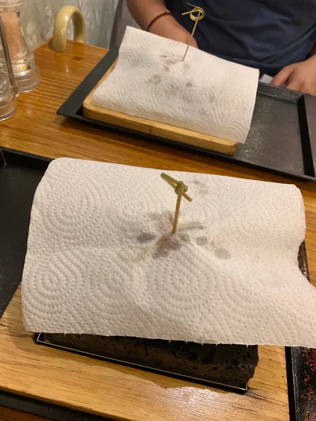 比較貼心係上檯時因爲牛肉已經在熱石上石燒中,而佢地會用一張大吸油紙先蓋住牛肉,以免油屑彈到客人。