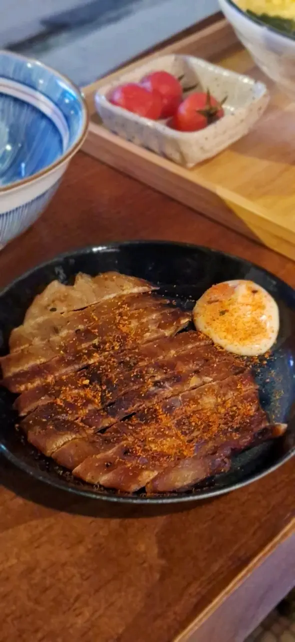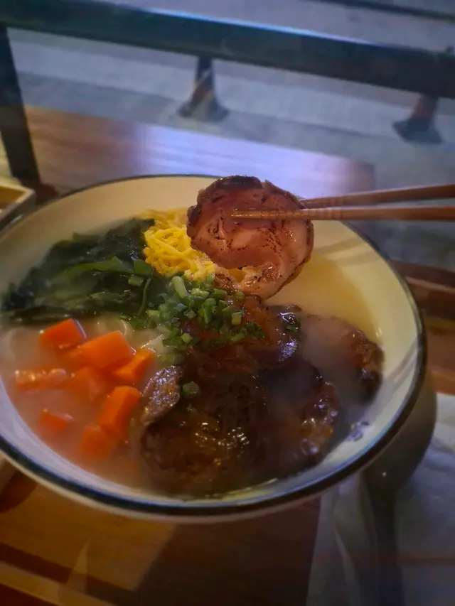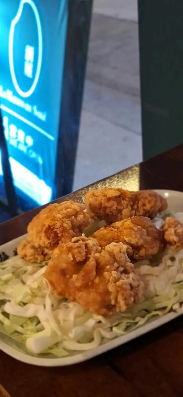 除了佐酒小食枝豆和雞泡魚乾,要了醬油豚肉烏冬,也順走了一塊多汁嫩滑唐揚炸雞。小食薄薄撒了七味粉,烏冬上是噴香的豚肉,旁邊舖了黃蛋條紅蘿蔔綠海苔,模樣可喜。