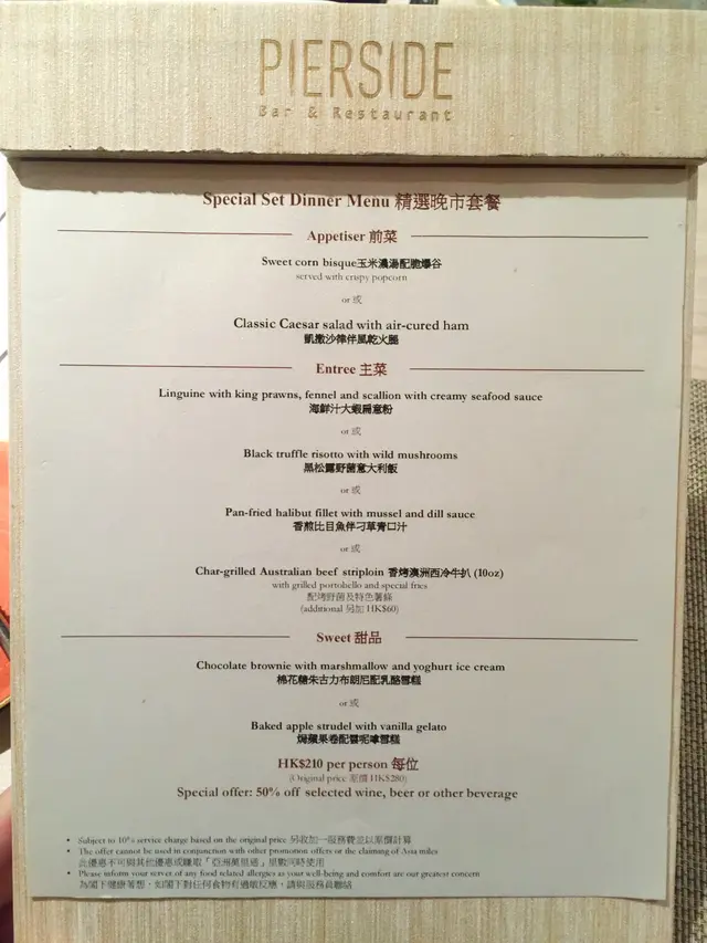 剛好最近堤岸酒吧及餐廳推出「三道菜精選晚市套餐」,連加一每位只需$238,定價相當吸引。如果預先網上訂座,指定紅白餐酒、啤酒和飲品更會有半價優惠。這晚市套餐優惠只至10月底,我們這晚就一於吃這套餐吧。