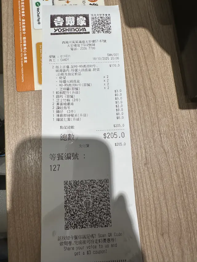壽喜燒和牛 or#ta67361895等级32025-10-1832 浏览 关注 晚餐求其同朋友去咗吉野家食飯,之後見到有嗰個壽喜燒濃湯底火鍋好有興趣,分別加咗腸仔同埋芝士狗卷,一個點好搞笑,佢將兩個火鍋嘅牛肉放埋一碟,跟住同我講話依間係特別啲要加$13同埋佢張poster嘅價錢係唔同,味道就不過不失,預先已經將配菜放晒入個煲度好容易滾瀉壽喜燒湯汁好濃太多水,分別叫咗雞肉牛肉同埋和牛,和牛油分適中配搭壽喜燒湯係好食,醬料剩係得芝麻醬略嫌有啲乏味,其他配菜都正正常常普通食飯時間冇咩人,如果用80幾蚊性價比中規中矩不過不失,但係要分開返裝M9澳洲和牛壽喜燒湯火鍋以上食记乃用户个人意见 , 并不代表OpenRice之观点。赞好分享壽喜燒和牛 吉野家 (太安樓) https://s.openrice.com/QrLT0ykql00检举 张贴 评分4味道4环境3服务5卫生5抵食推介美食M9澳洲和牛壽喜燒湯火鍋用餐途径堂食