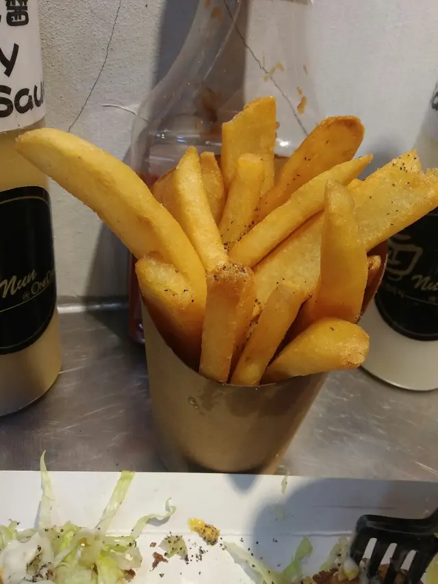 而薯條就無特別,意外係粗薯大大條外脆內軟,薯蓉炸得好鬆軟香滑,撒上黑椒粉簡單都幾好食。