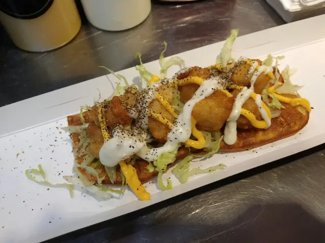 唔洗等好耐就有得食,窩夫賣相惹人垂涎欲滴,雞塊佈滿整個窩夫淋上塔塔醬芥末醬加黑椒