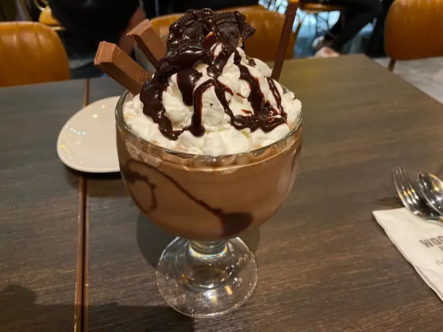 飲品我哋叫咗朱古力巨人,上邊有啲cream,同埋百力支同Kitkat。撈埋啲cream之後都唔係好甜,啱晒我。
