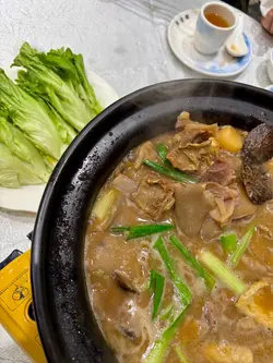 上枱時成煲熱辣辣,份量大到4個人都夠食。羊腩處理得好好,非常腍,但完全唔覺肥膩;配料超豐富,有冬筍、冬菇、馬蹄、枝竹,冬菇尤其厚肉又滑,吸晒汁好惹味。仲附送一大碟生菜,夾埋羊腩煲一齊食,解膩又平衡。