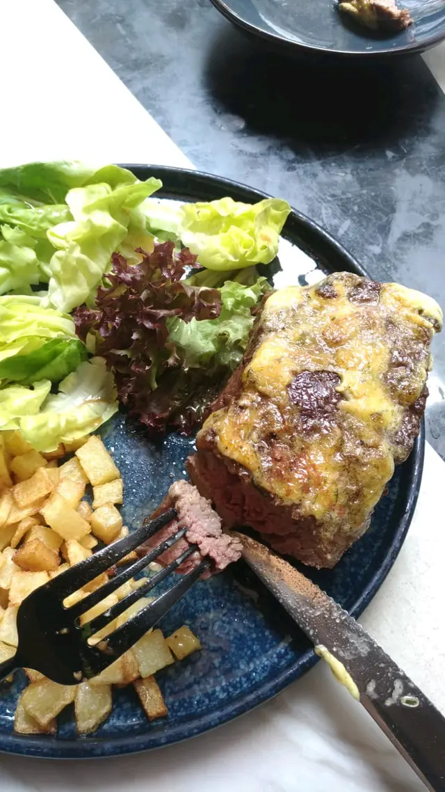 我點的慢煮澳洲牛肩肉配炙燒荷蘭汁配沙律及香脆薯粒也跟着上枱。