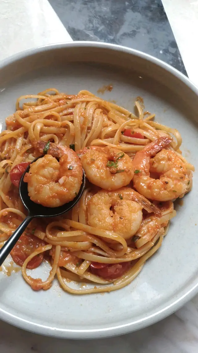 太太點的主菜是龍萵蕃茄大蝦幼扁麵。蝦肉新鮮弹牙,份量充足,我最愛的就是那帶羅勒香味蕃茄汁,非常醒胃!