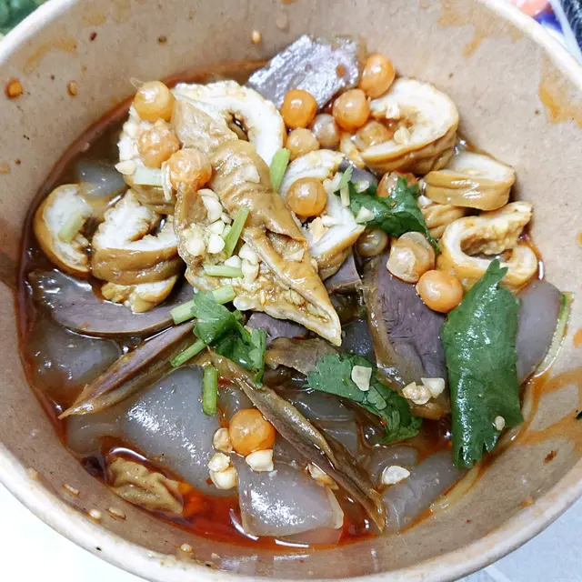 接收咗其中一碗微辣涼皮,配料係肥腸+腎
