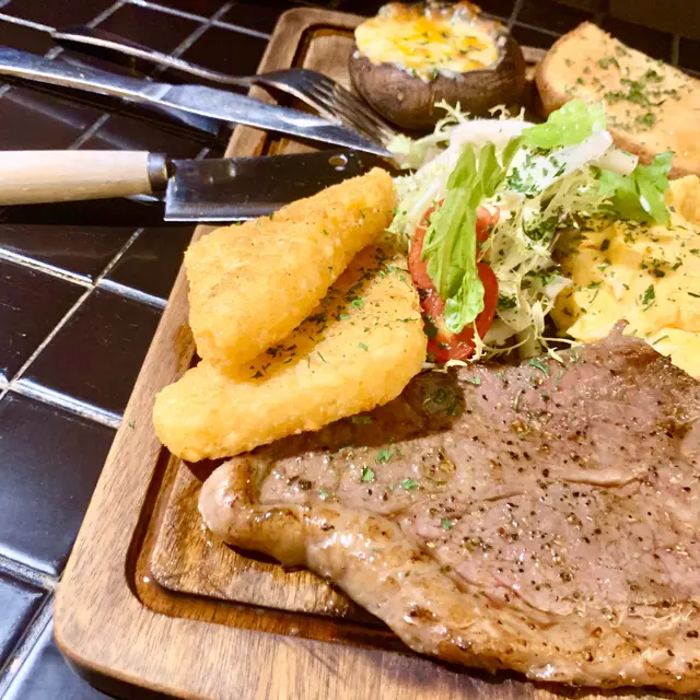 配料有 芝士焗蘑菇、薯餅、炒蛋、烘面包 和牛扒。看上去挺豐富的!