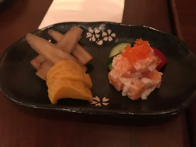 前菜有牛膀,醃蘿蔔,同明太子沙律!平時我一定會剩返啲前菜,今次食下食下食晒,因為真係整得好味,特別係正方粒嘅明太子,咬落去口感好正!