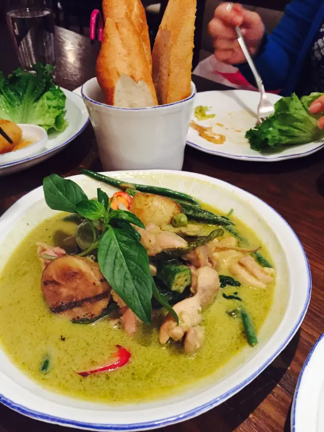 青咖喱雞(蒜茸包)-呢度既青咖喱相對其他顏色係最辣既而且無咩椰奶! 咖喱汁好香, 可能因為有好多配料, 雞肉都幾滑。最中意佢入面仲有薯仔, 秋葵, 泰國茄子!