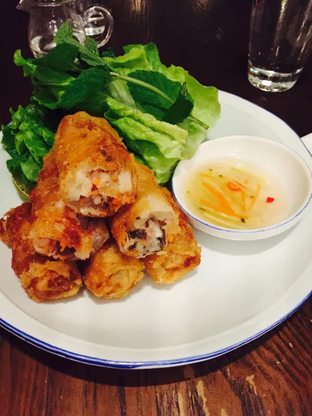 越南春卷-有別於中式/泰式春卷, 佢既皮係用米紙炸成既, 裡面有檬粉豬肉馬蹄等等, 夾埋生菜再點少少"碌淋"汁, 又脆又煙軔, 會食上癮