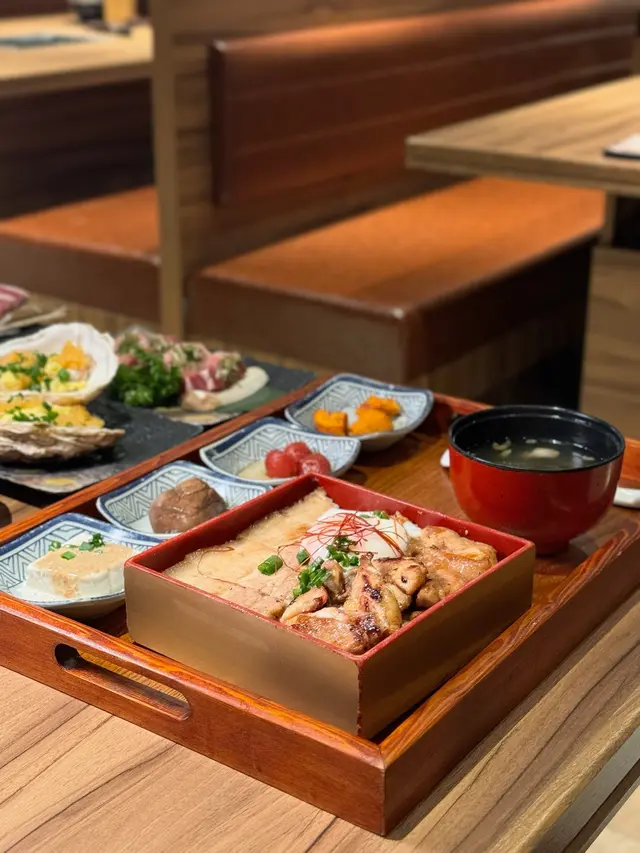 炭燒五花肉同雞肉,配上照燒汁同流心蛋,非常惹味。另外有胡麻豆腐、茄子和糖漬蕃茄等配菜,味道豐富。牛骨湯仲多左牛肉和胡椒香。
