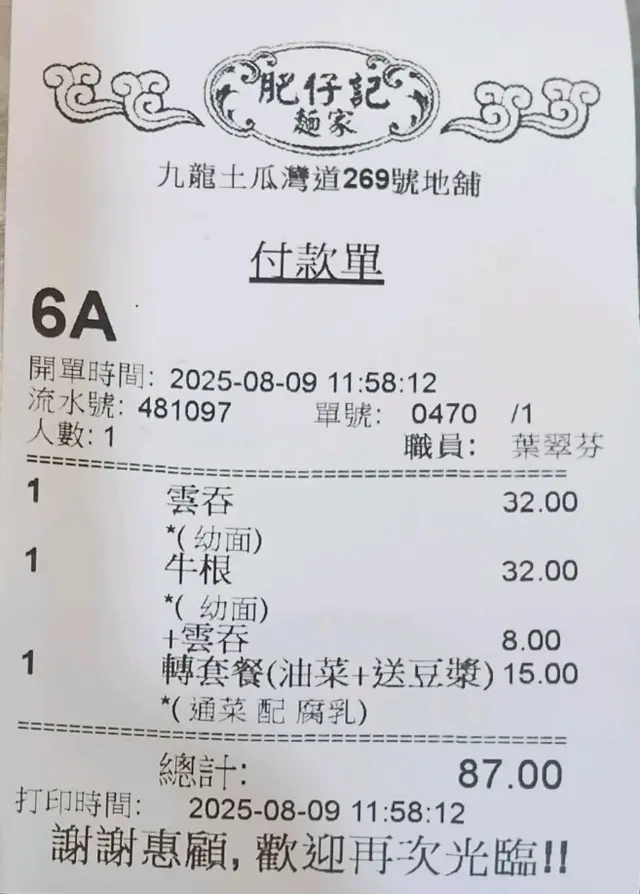 好食👍🏻扺食👍🏻可借美中有足😵 揾食肥華等级42025-08-09156 浏览 关注 8月9日揾食肥華和靚媽,往土瓜灣食糖水前,因利乘便先到此間麵店,食碗傳統廣東麵食,打打個底先。今餐肥華喺柯打咗個,雲吞麵餐,内有一碗雲吞麵,一碟腐乳通菜及一杯凍荳䊢,講真此麵餐内三款食品,都非常味美,質量都對得住,顧客所付出嘅價錢。而靚媽點嗰碗,牛筯雲吞麵,亦喺高水準之作,由湯底到幼麵及牛筋和雲吞,都獲靚媽稱讚。本來今餐真喺,低食又好食,都冇乜可彈,但此店美中足喺,枱面上嘅調味醬料,竟然欠缺咗食廣東雲吞麵嘅最佳拍檔,個款橙色廣東辣椒醬,就喺令肥華對此店呢餐唯一不滿嘅評語,今餐值。⭐️⭐️⭐️⭐️⭐️1以上食记乃用户个人意见 , 并不代表OpenRice之观点。赞好分享好食👍🏻扺食👍🏻可借美中有足😵 肥仔記麵家 https://s.openrice.com/QrLT0jyzNG0检举 张贴 评分5味道4环境4服务4卫生5抵食用餐途径堂食