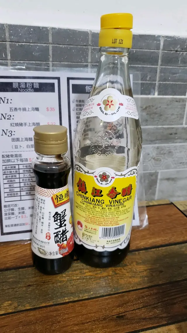座位放有菜單、鎮江香醋和蟹醋一支,之後蟹醋仲要係未開蓋。