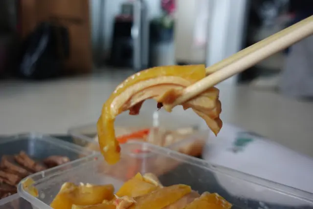 夾起一件鮮黃色脹卜卜嘅雞皮和去骨雞 放入口,雞肉非常嫩滑,加上雞皮油脂口感相當滑溜;吃第二件鷄點上黑醬油和薑蓉