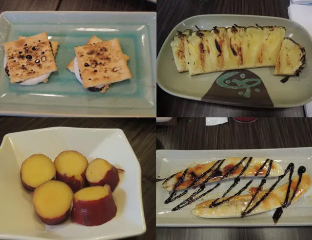 左上「燒超美味一口甜薯」 一串5粒,$22 好像有點貴,但粉嫩軟綿的感覺,美味,沒有燒焦,一口一粒,必選的小食