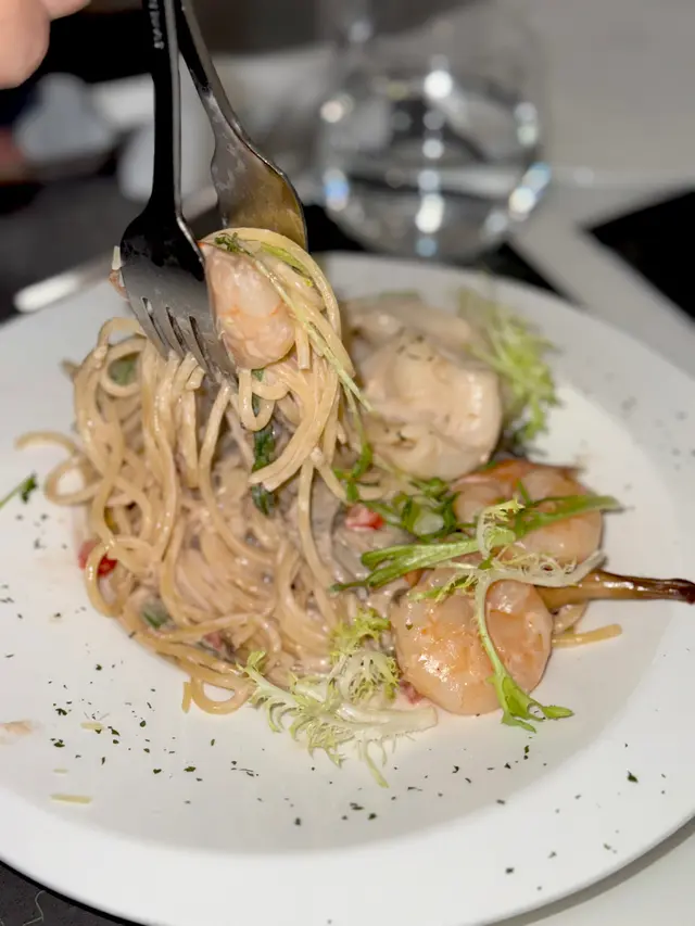 以大澳蝦醬為基底,鮮香撲鼻。魷魚筒切成薄片,搭配鮮嫩的鳳尾蝦,煙韌得黎又有啲彈牙,意粉吸收左蝦醬嘅鮮味,但又唔會覺得太鹹。