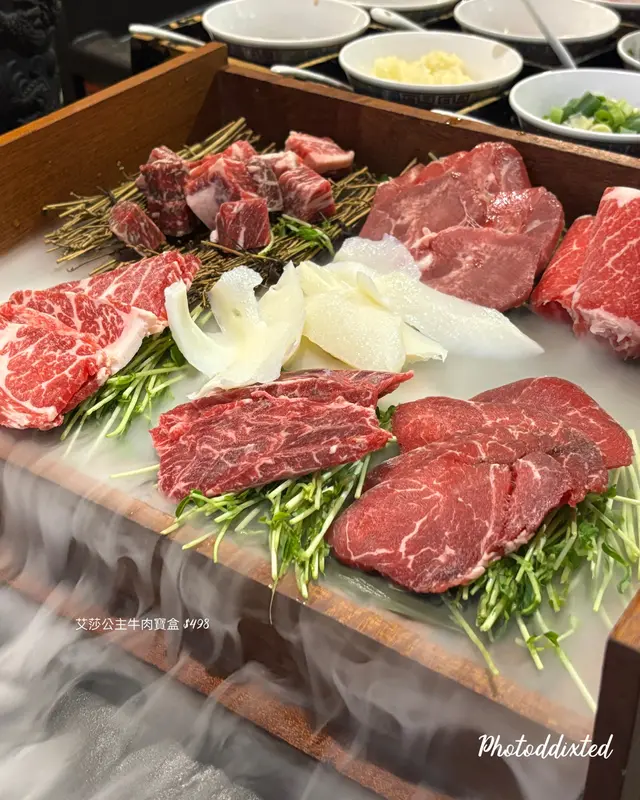 😋打邊爐一定要食牛 所以牛肉寶盒一定必叫 一上枱陣陣煙霧瀰漫🌫️未食都夠震撼 包7款: 手切牛崩沙同牛肉 新鮮牛𦟌 雪花肥牛 牛黃喉 牛肉粒 同牛舌花 一次食7款 當中以牛肉粒有啲驚喜