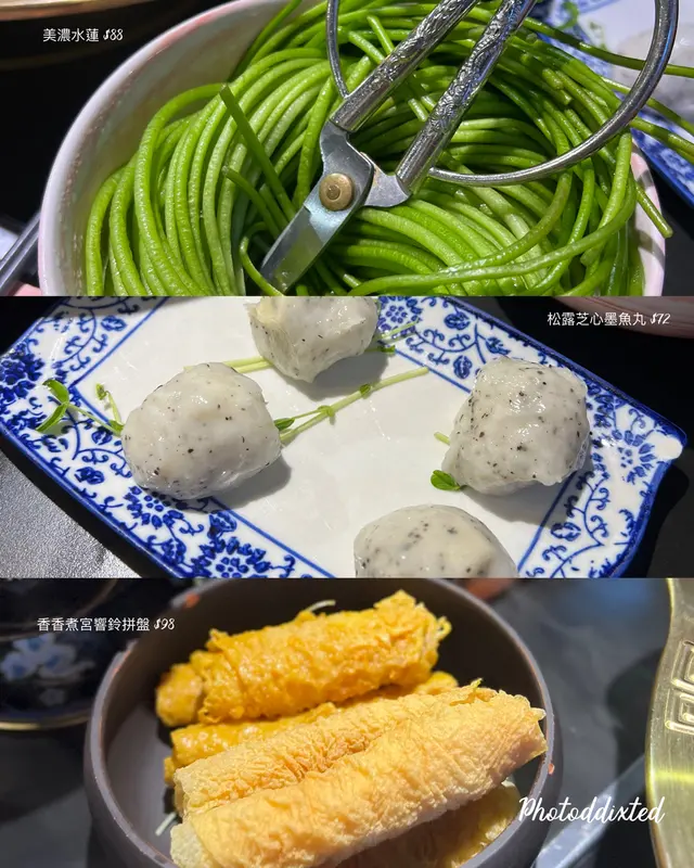 👌🏼:松露芝心墨魚丸、自家製竹蔗茅根、香香公主鴛鴦湯鍋(芫茜山湯鍋、椰子雞湯鍋)、公主醬介