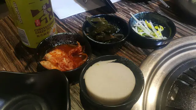 餐廳先提供了配菜,傳統的韓式泡菜,醬荳芽,其中白蘿蔔用於洗擦燒烤板。