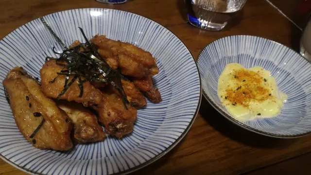 介茉炸雞 呢個係炸過既雞翼同雞鎚, 配以芥茉醬, 雞肉炸得出面脆入面滑, 而芥茉醬幾特別,係日本沙律醬配以WASABI 醬, 味道吾錯
