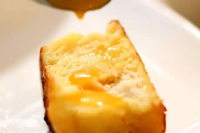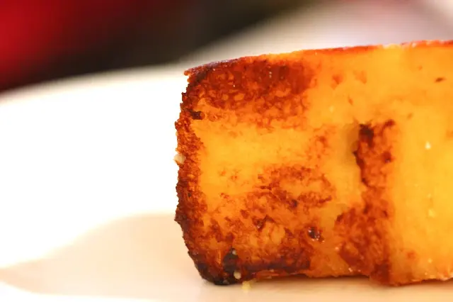 先切下多士,內的的蛋汁牛奶溢岀,多士製作需時,要淋在蛋漿內很長很長的時間,難怪變得像一塊充了水的海綿。