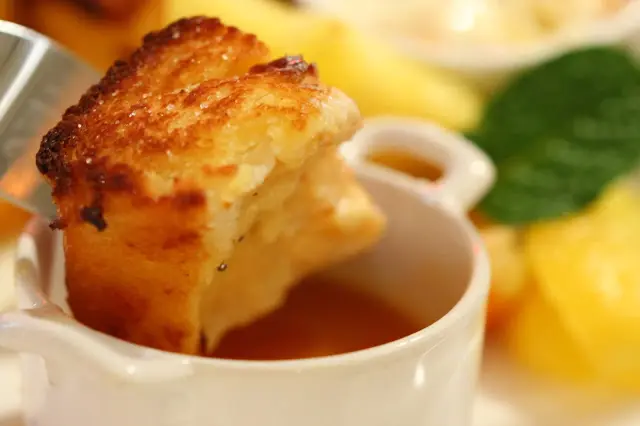梳乎厘多士旁配了焦糖醬,雲呢拿雪糕及水果。