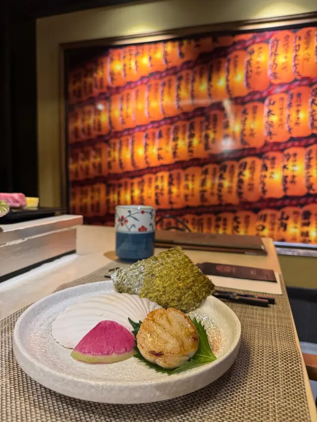 (鮮活帶子)上面放有柚子胡椒,包住紫菜食,新鮮又爽口。
