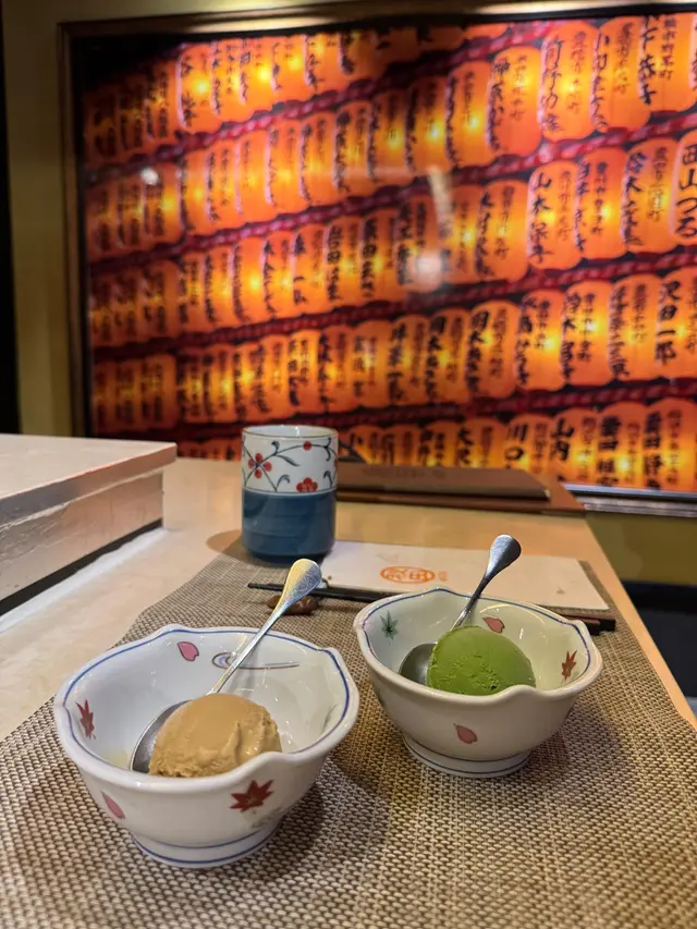 (🫘豆沙燒餅+🍨雪糕)用上天婦羅粉、蜜糖做成嘅餅皮,焦香酥軟,配上紅豆或者雪糕,同樣美味。