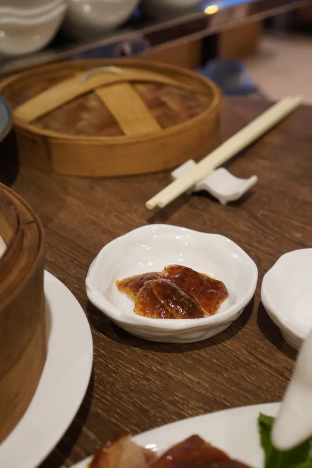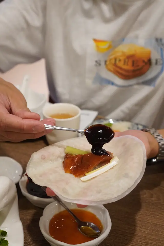薄薄的餅皮帶煙韌口感。配料除了有經典的京醬、青瓜和京蔥絲外,更有哈蜜瓜和蜂蜜黃梅醬,充分中和油膩感!