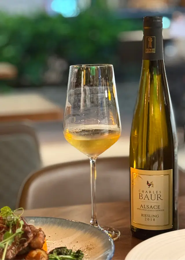 因為是chill bar,喜好品酒的我們還點了3款酒。老闆推薦了一款來自法國亞爾薩斯的一家酒莊「Charles Baur」有機Riesling白酒,這款酒在嗅覺上帶有🌸花香和柑橘類水果的香氣,口感清新爽口,帶有🍇葡萄柚和酸橙🍊的味道,並具有迷人的礦物味。