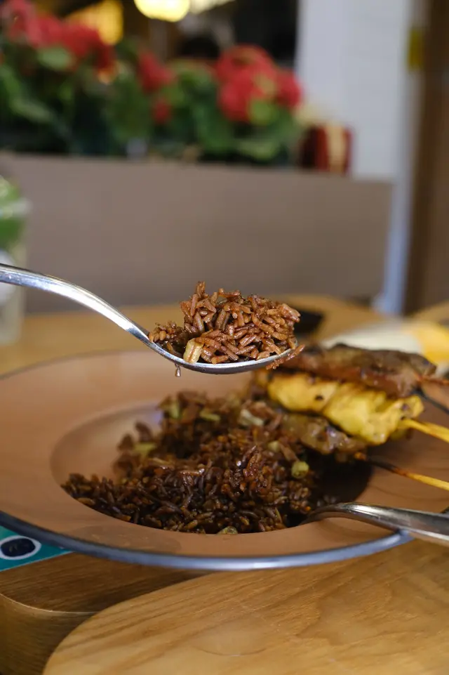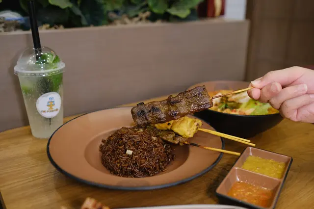 抵食之選!平日就咁食三條串燒已經差不多係呢個價,還要加上有飯!平日泰國餐廳食串燒幾條都幾十蚊,仲有個有味飯底一齊食。正常是跟雞肉、牛肉、豬肉,不過當日到訪沒有豬肉,都唔緊要,牛雞串燒各2串,食落啖啖肉,而且整個份量幾足,配粗粒花生沙嗲醬及泰式酸辣汁。飯粒粒分明,雖然顏色好深,其實係調味料的顏色,不是豉油了啦。
