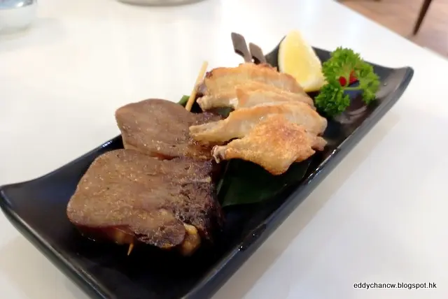 坐下來, 先來兩款串燒, 鹽燒牛舌串-牛舌燒得邊位呈焦香才拿上檯,賣相吸引且香味十足,質地爽口而富有嚼勁,且散發濃郁的肉香。 鹽燒雞中翼串-燒得雞皮脆身還帶點焦香, 雞肉口感很嫩滑,燒香後撒上鹽去調味, 吃起來就更加惹味。