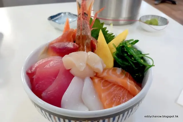 店員送上雜錦魚生丼, 單看賣相已經是先聲奪人, 多款刺身堆得滿滿的, 包括有赤蝦、帆立貝、北寄貝、三文魚及吞拿魚等等。赤蝦夠大隻,吃起來鮮味也啖啖肉;帆立貝厚肉而鮮味十足;三文魚肥美, 整體來講是有水準的。