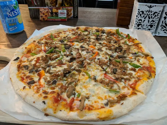今次點意大利式腸pizza,材料有意大利腸、蘑菇、燈籠椒、芝士同埋香草,材料豐富,食落有層次,賣相色彩繽紛都幾吸引。pizza嘅分量大,有14吋,分成八小件兩個人share食到超級飽。pizza係熱辣辣嘅,小心注意,但係要趁熱食先好食。
