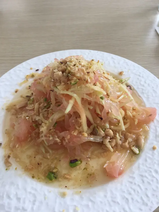 柚子肉混合青木瓜、花生碎,淋上特製醬汁,一道酸甜清爽的創意美食。