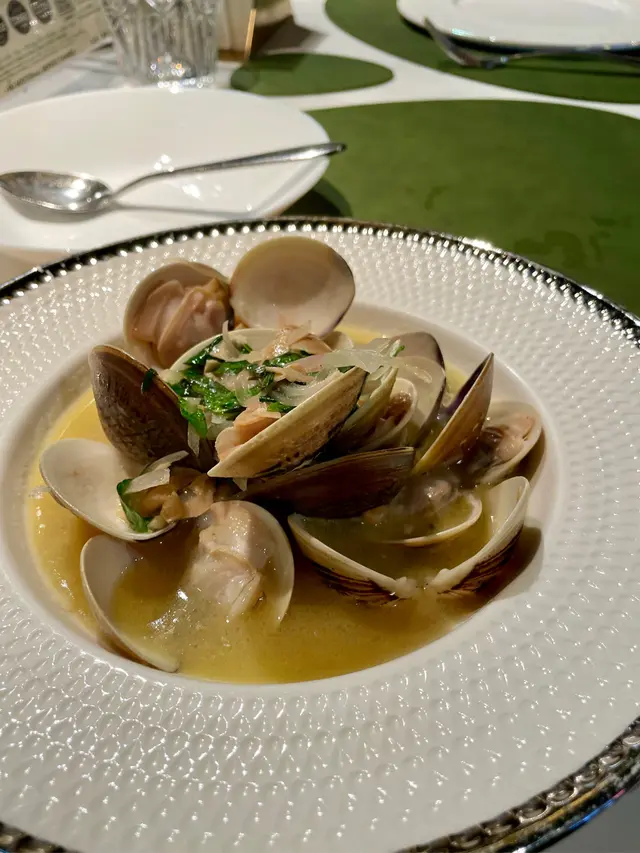 前菜白酒煮蜆,蜆肉鮮嫩彈牙,肉質飽滿,白酒香氣滲入其中,湯汁清甜不膩,成功喚醒味蕾。