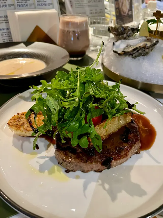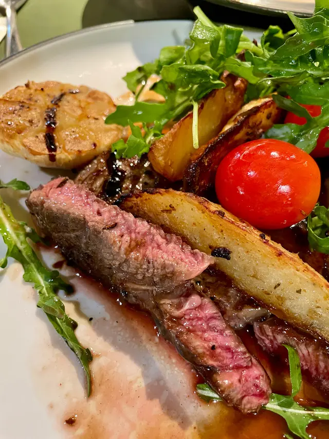 紐西蘭頂級肉眼牛扒配薯角及紅酒牛仔汁,Medium火候掌握得宜,外焦內嫩,肉汁豐盈。沙律清新爽口,平衡了肉類的油膩感。