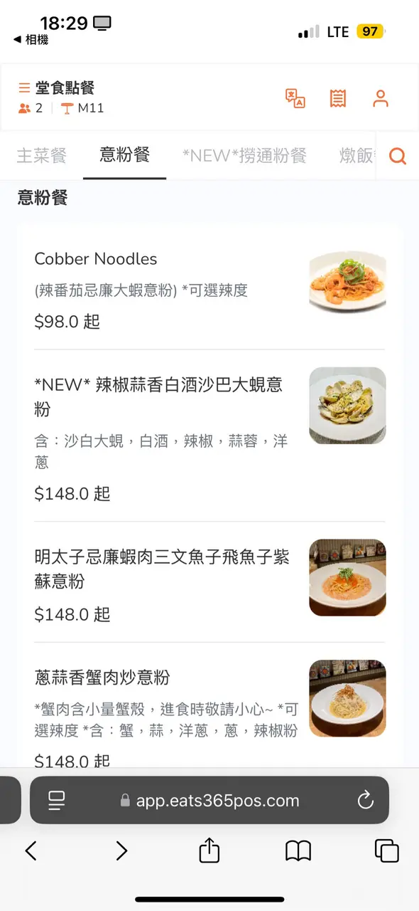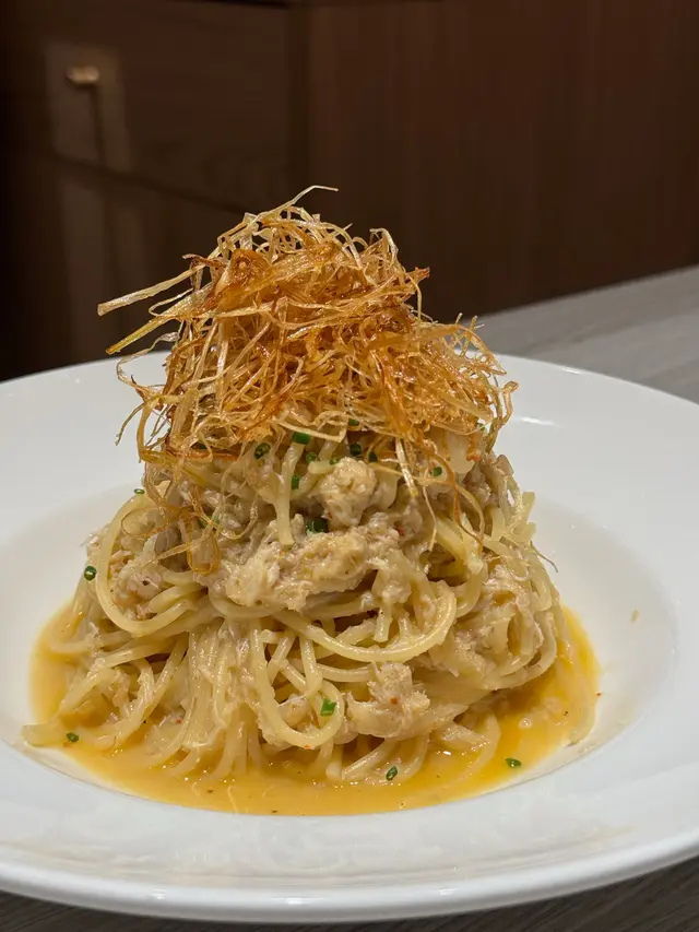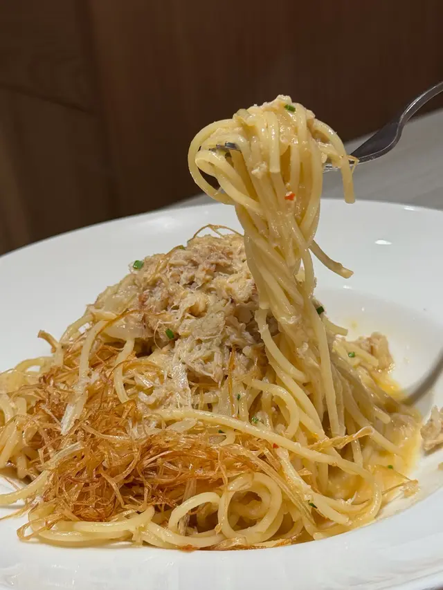 蔥蒜香蟹肉炒意粉,可以自己揀辣度或者唔辣